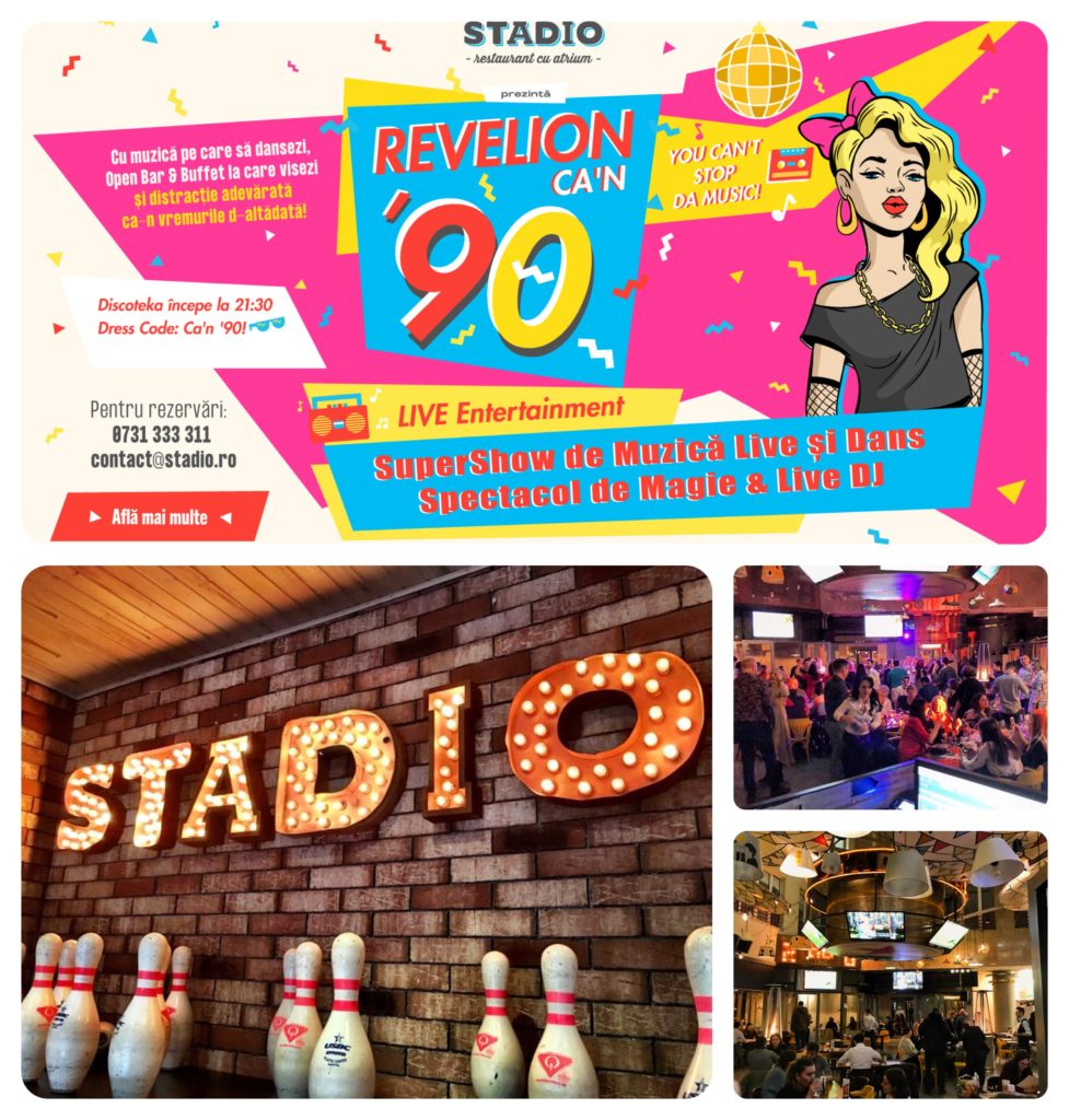 Hai să ne distrăm ca-n ‘90 de Revelion! Nu știu cum se face și cum au descoperit ei rețeta minune, dar la Stadio nu ai cum să nu te simți bine! Este un loc din zona Universității, atât de relaxat și fresh încât uiți de toate inhibițiile și te simți în largul tău. De Revelion, la Stadio e cu muzică pe care să dansezi, open bar & buffet la care visezi și distracție adevărată ca-n vremurile d-altădată! Discoteka e super show de muzică live și dans, plus un spectacol de magie și live DJ. Iar ca să fie treaba treabă, în meniu au pus bunătăți una și una, cum numai ei știu să facă! Meniul este tip open buffet și open bar.