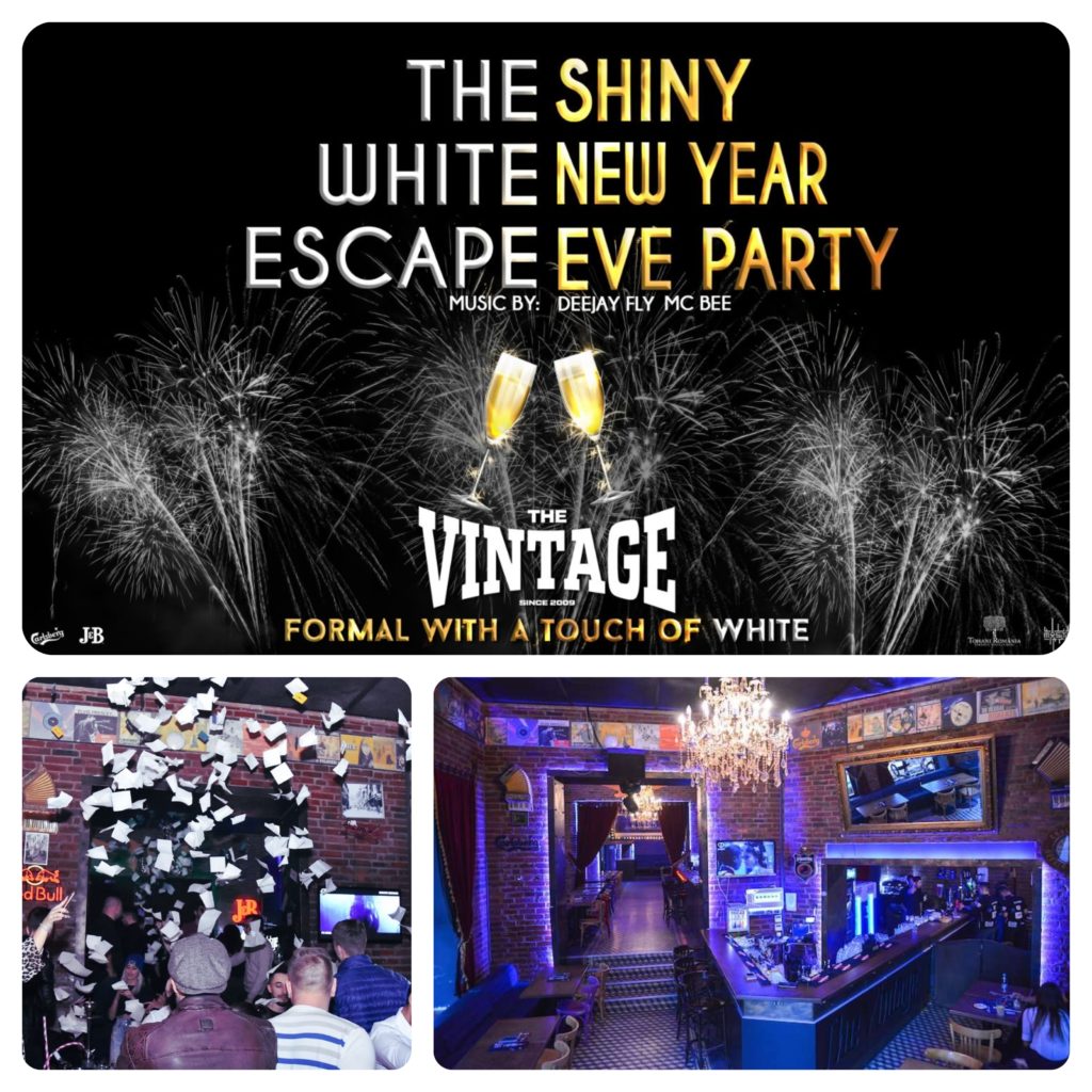 Tot în zona baruri/puburi se înscrie și The Vintage. Și tot în Centrul Vechi, tot pe strada Smârdan. Nu e weekend în care aici să nu se țină o petrecere! Drept pentru care are renumele de pub în care mergi să dansezi și să bei ceva, pentru ca apoi să te distrezi până dimineața. Pentru petrecerea dintre ani, The Vintage a ales ca temă The Shinny White Escape. Așa că hai să strălucim împreună până dimineața și să întâmpină anul cu scântei, zâmbete și vise noi pentru anul ce urmează! Totul pe muzica lui Deejay Fly și Mc Bee. Dresscode: formal with a touch of white.