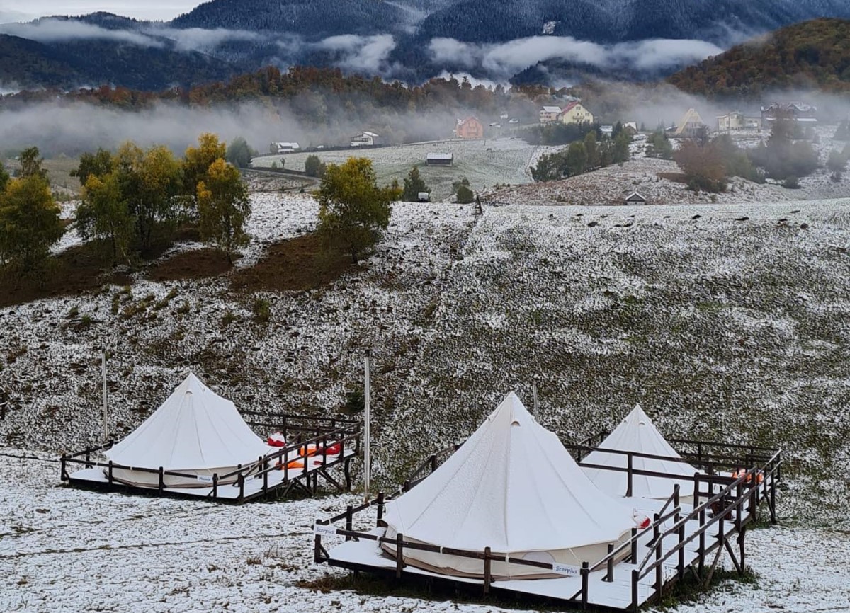 corturi de glamping la Ursa Mica Glamping Resort, fotografiate iarna, cu pajistea acoperita de un strat subtire de zapada - destinație experiență de Crăciun