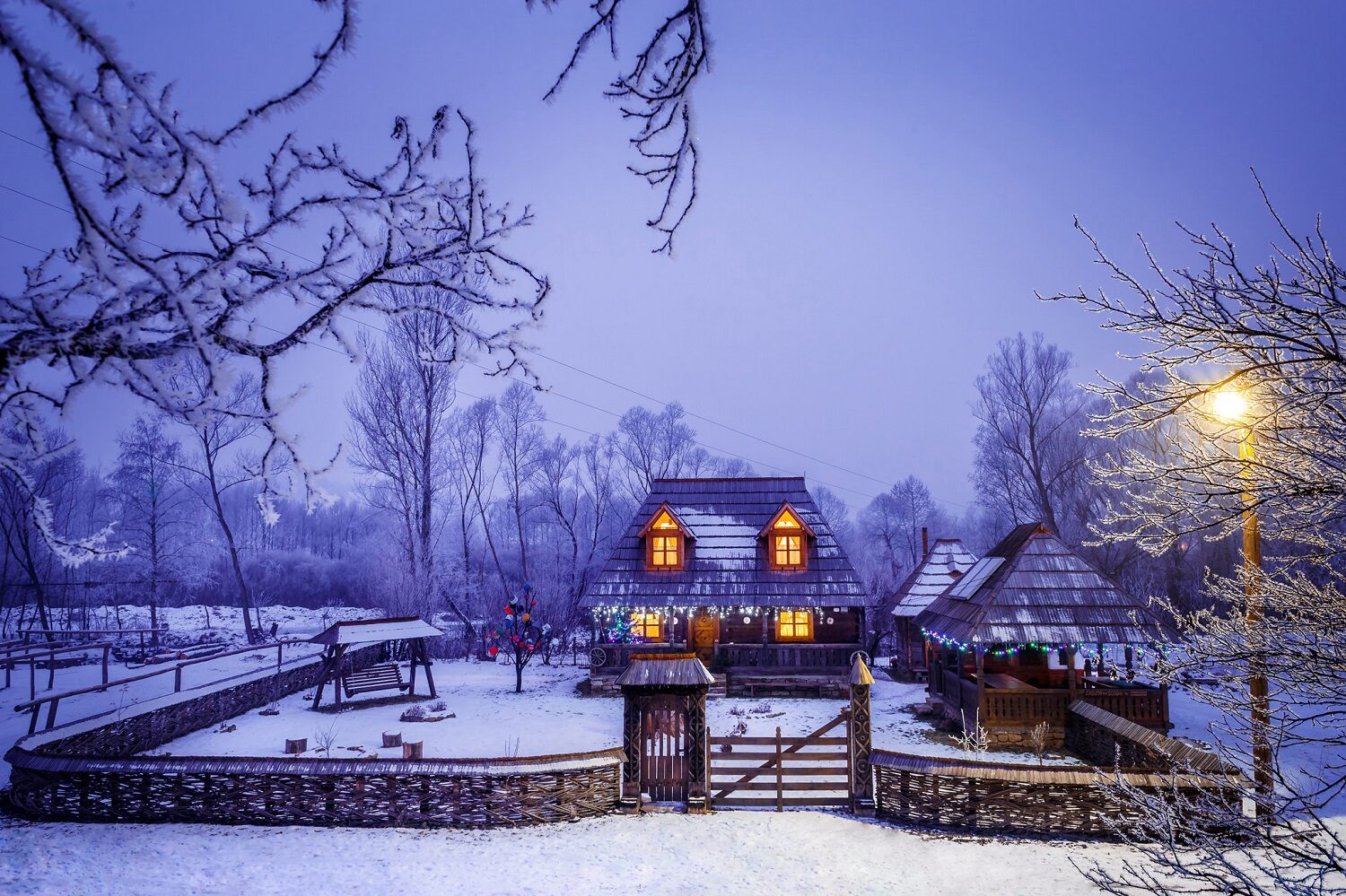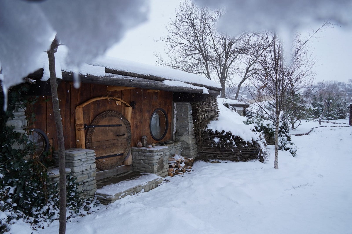 casuta mica, din lemn, de la Valea-celor-XII, fotografiata iarna cu curtea plina de zapada, una din destinații experiență pentru Crăciun