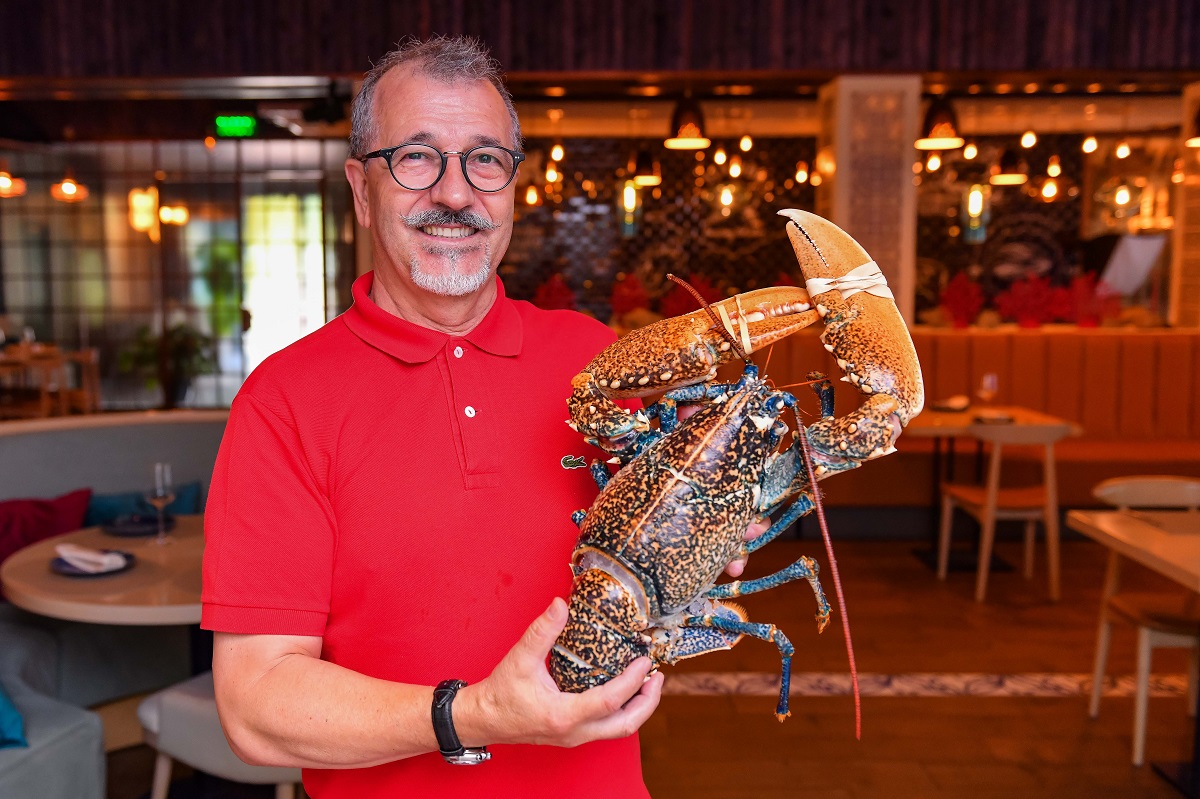 Jose Gaspar, proprietarul restaurantului Dancing Lobster, imbracat in tricou rosu, tinand in maini un homar foarte mare