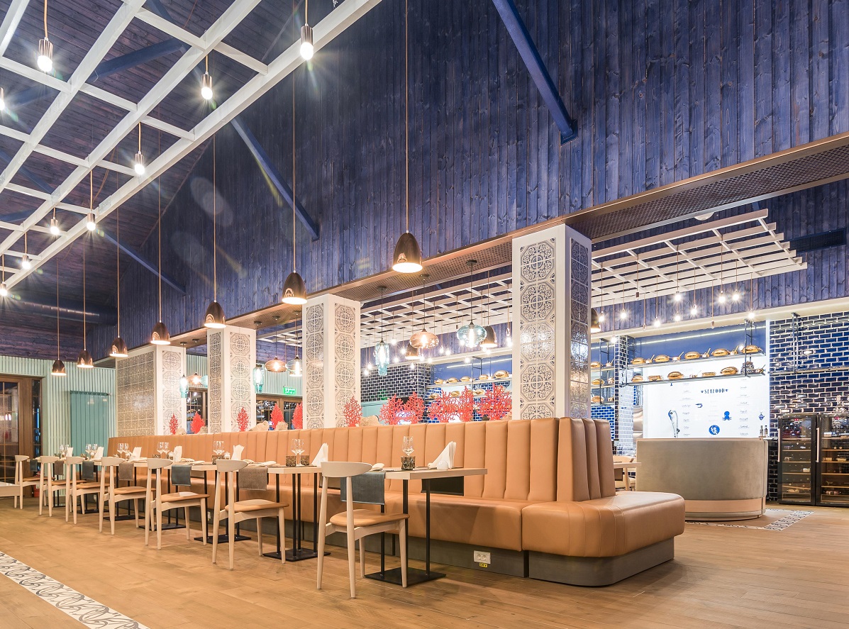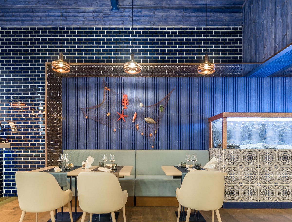 imagine de ansamblu din interiorul restaurantului Dancing Lobster, cu un sir de mese in fata unei canapele, vitrine cu peste in spate si pereti albastri