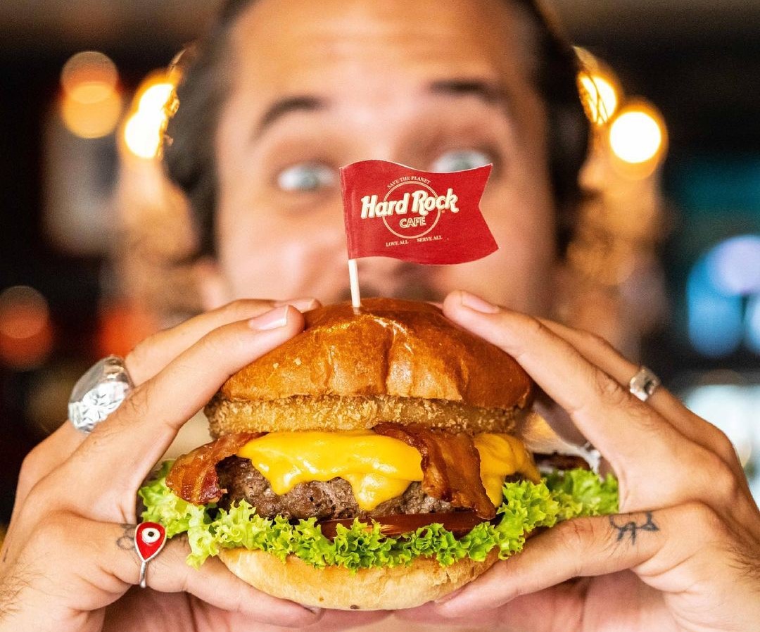 Noi am ales azi Original Legendary Burger de la Hard Rock Cafe. Că doar n-o fi legendary degeaba. Un steak burger din carne proaspătă de vită Angus, cu bacon afumat, brânză Cheddar, inel crocant de ceapă, salată verde, o felie de roșie, servit alături de sosul casei. Alături de el mai găsești în meniu o mulțime de alți burgeri delicioși, serviți în chifle proaspăt rumenite, alături de cartofi prăjiti (dar pentru 11 lei în plus poți înlocui garnitura). Sunt foarte mari și foarte gustoși.