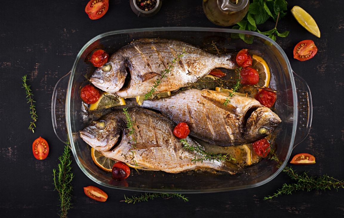 tava cu 3 pesti facuti la cuptor, cu rosii cherry, fotografiati de sus pe fundal negru, ca parte din dieta antistres