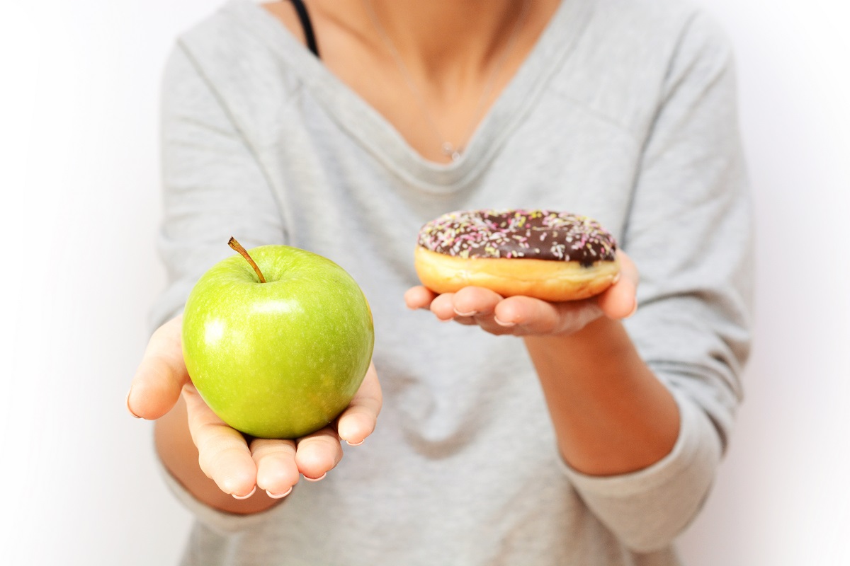 femeie care are intr-o mana un mar si intr-o mana o gogoasa, concept pentru optiuni sanatoase