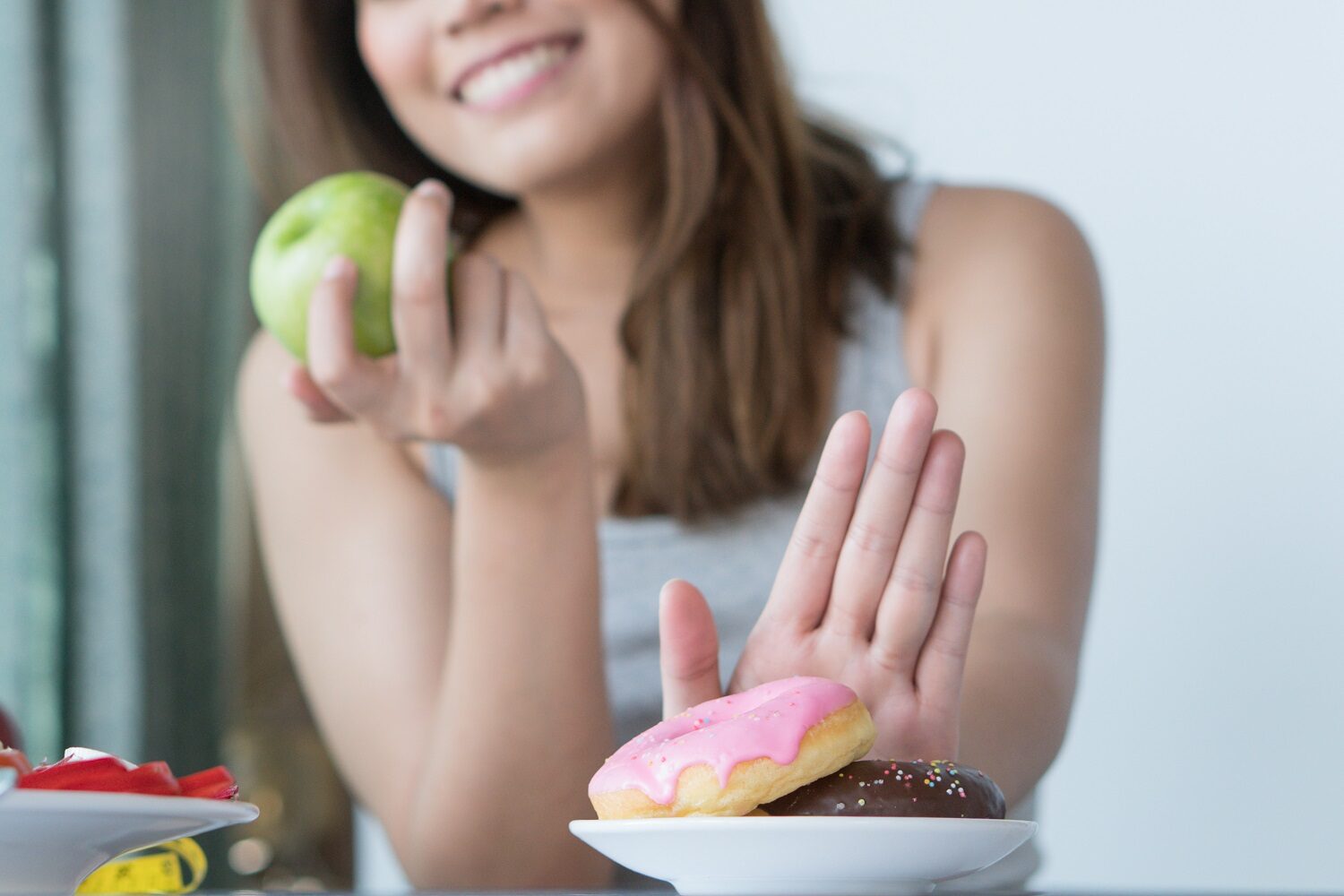 Woman on dieting for good health concept. Close up female using hand push out her favourite donut and choose green apple and vegetables for good health. Imagine reprezentativa pentru ce se întâmplă când nu mai mănânci zahăr