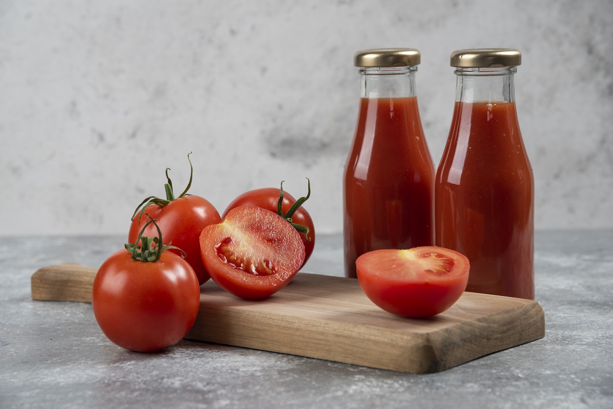 Spală roșiile, taie-le în sferturi, după care trece-le prin aparatul pentru suc de roșii. Sucul astfel obținut toarnă-l într-o oală cu fund dublu. Lasă să fiarbă la foc mic, amestecând din când în când. Adaugă frunzele de țelină și pătrunjel și un praf de sare. Lasă pe foc până când scade un sfert din volum sau mai mult, dacă îl dorești mai gros. Îndepărtează frunzele şi toarnă sucul în sticle de circa 350-500 ml. Închide ermetic și acoperă sticlele cât sunt fierbinți în pături. Lasă-le așa până a doua zi. Pentru siguranță, fierbe a doua zi sticlele la bain-marie timp de aproximativ 20 de minute.