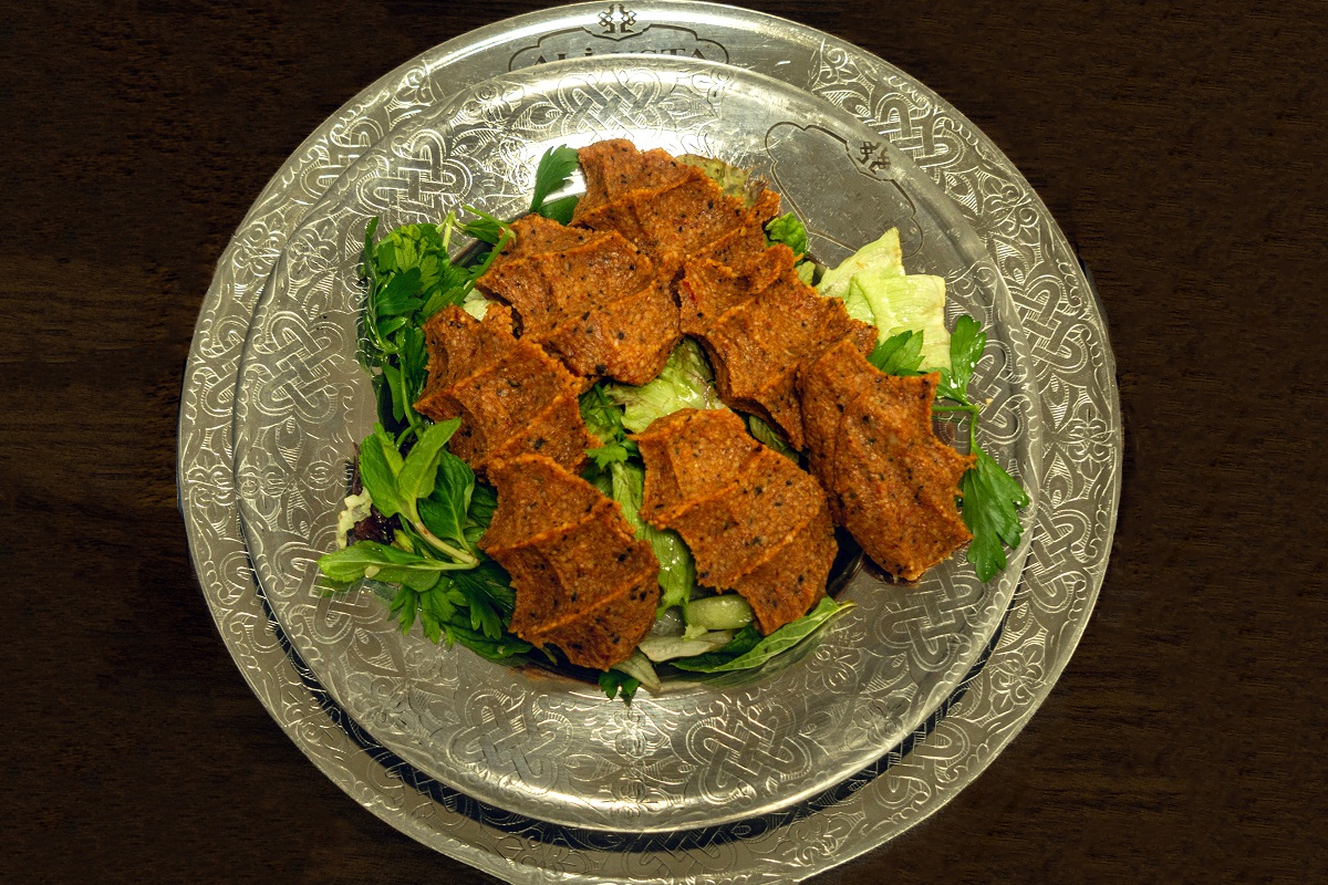 Pune bulgurul într-un vas încăpător, adaugă nuca măcinată și pune apa fierbinte peste. Lasă la înmuiat vreo 30 de minute. Adaugă ceapa tocată fin, usturoiul presat, pasta de roșii și pe cea de ardei. Pune apoi toate mirodeniile, zeama de lămâie, uleiul și verdeața tocată. Mixează totul în blender (dacă iese uscat amestecul, mai poți adăugă ulei de măsline). Modelează chiftele sub formă de mici și servește-le cu salata verde cu zeamă de lămâie sau sos de rodie.