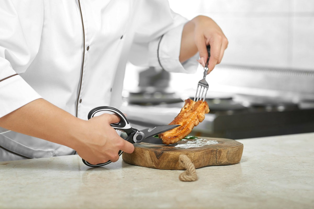Deși nu este chiar ceea ce s-ar numi „cuțit”, își are și ea locul în listă. Dacă ai văzut și o foarfecă în trusa de cuțite, să știi că nu este acolo din greșeală și nici pentru a tăia hârtia de copt. Sunt situații în care ea poate fi chiar mai utilă decât un cuțit. Cu foarfeca de bucătărie poți tăia ierburile aromatice mai rapid și mai bine decât pe tocător, poți să porționezi puiul – fie că e în stare crudă sau rotisat –, poți mărunți ardei gras, ciuperci, fructe confiate sau uscate, bucăți de rahat sau poți cresta aluatul. Tai precis și nici nu te murdărești pe mâini!