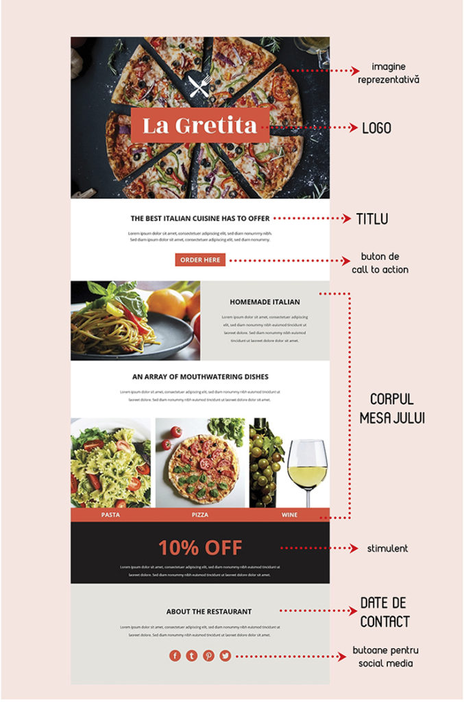 Cam acestea ar fi cele mai importante elemente ale unui newsletter. Nu uita că această metodă este una dintre cele mai bune pentru a intra în contact cu clienții tăi, și de a valorifica relația cu ei, dincolo de experiența din restaurant. Cu elementele potrivite de design și informații persuasive, vei reuși să le captezi atenția și să-i faci să revină la tine.