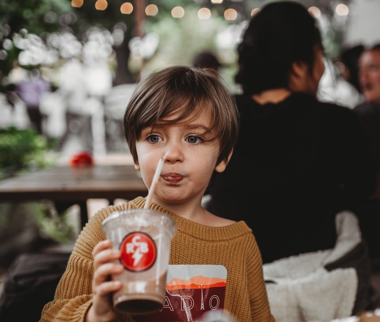 baietel sorbind suc cu paiul dintr-un pahar transparent e plastic