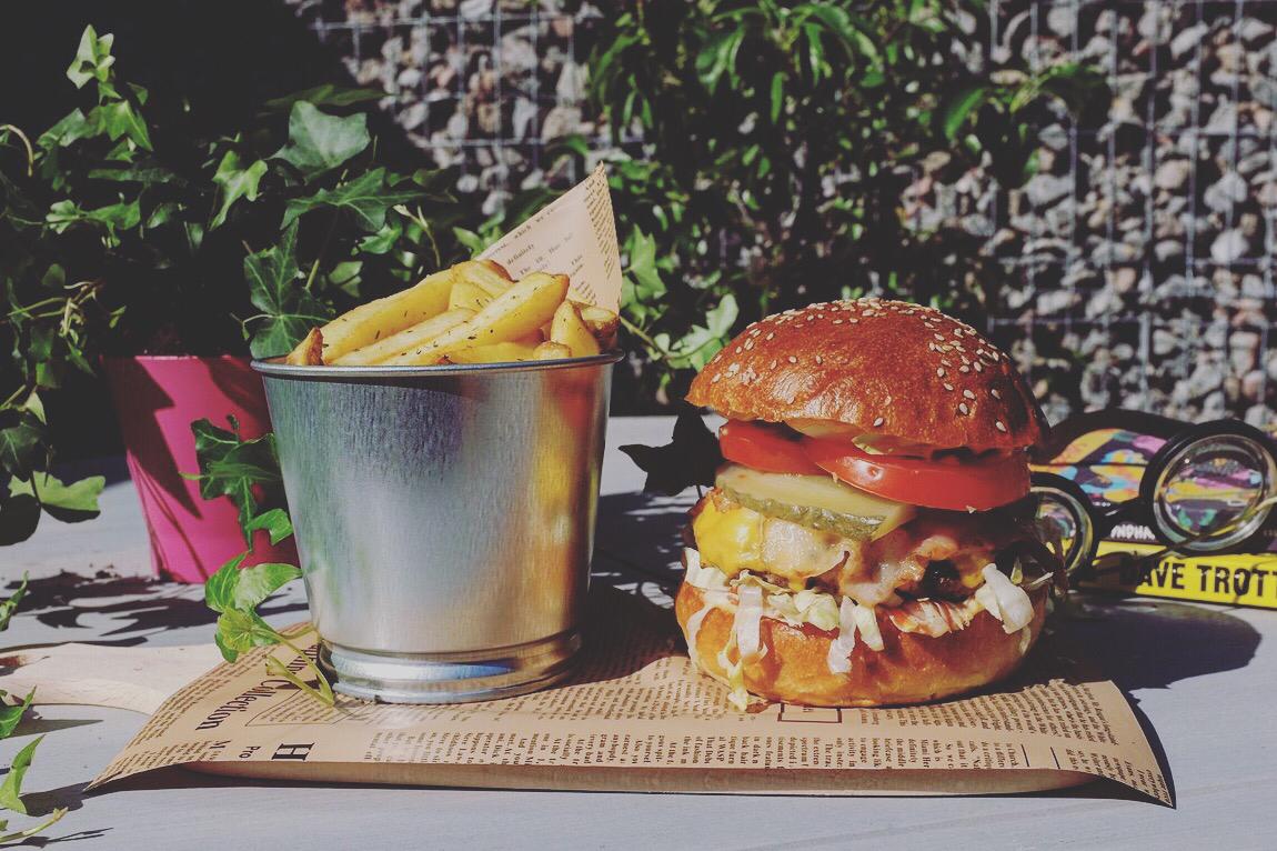 burger de la restaurant flipflop, asezat pe blat de lemn, langa care se afla un recipient metalic cu cartofi prajiti