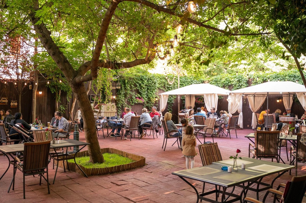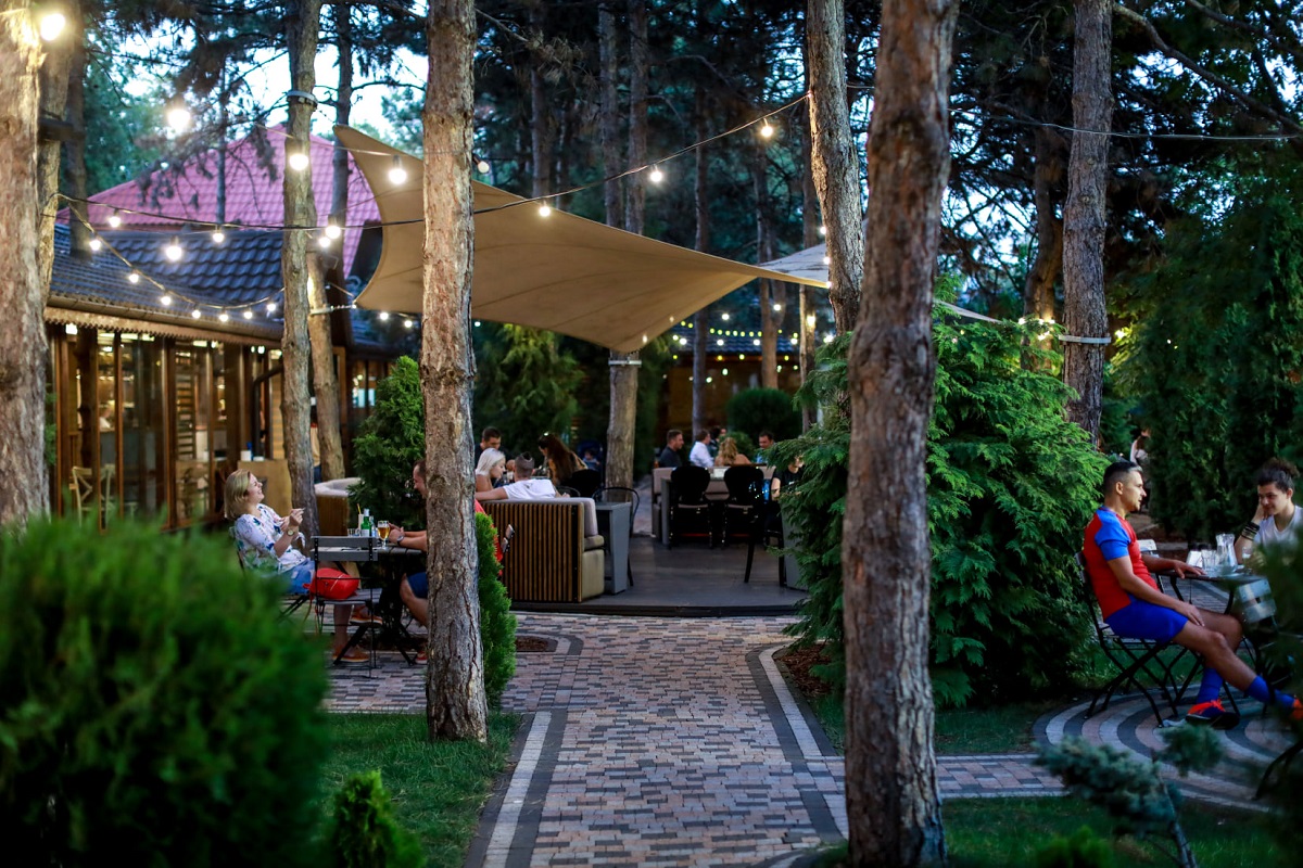 Grădina restaurantului Simbio din Bucuresti, privire de ansamblu, cu mese asezate printre copacii desi si mese care iau masa
