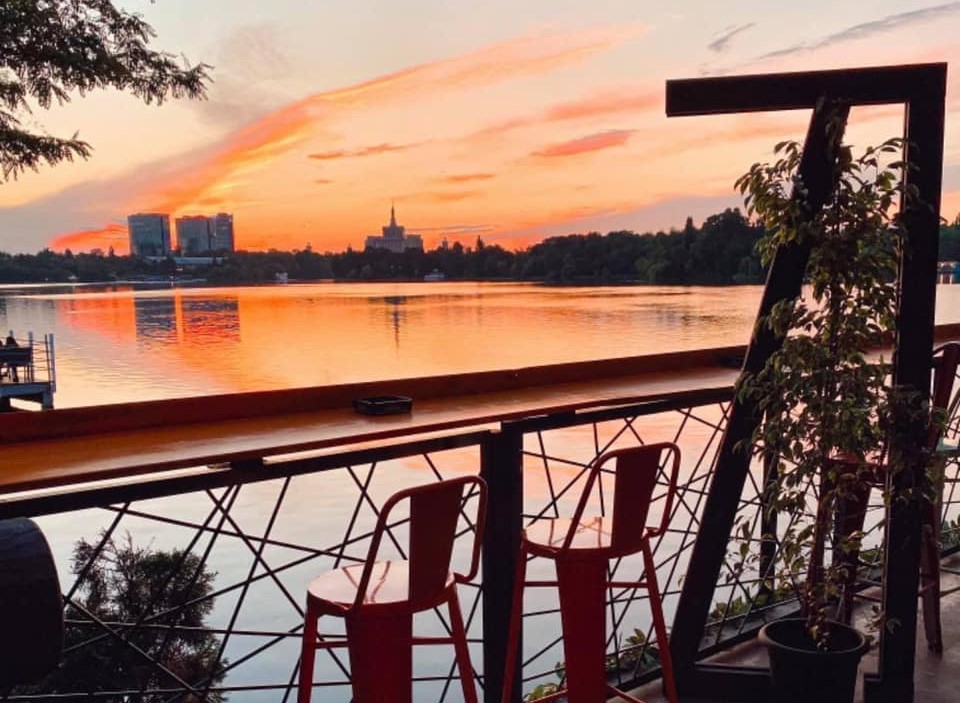 Apus de soare pe terasa Funky Lounge de pe lacul Herăstrău
