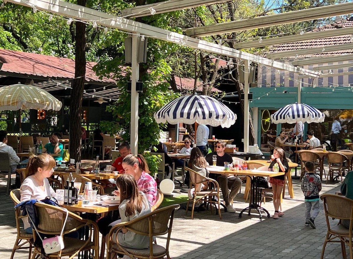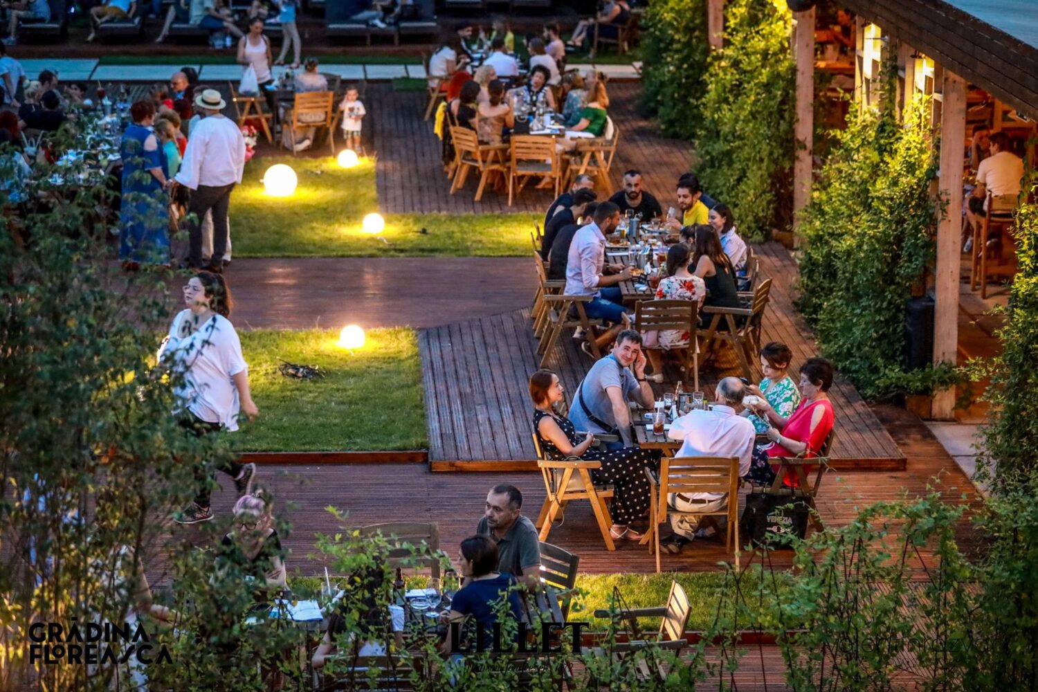 Gradina Floreasca din Bucuresti, cu mese ocupate de clienti si decor cu plante verzi