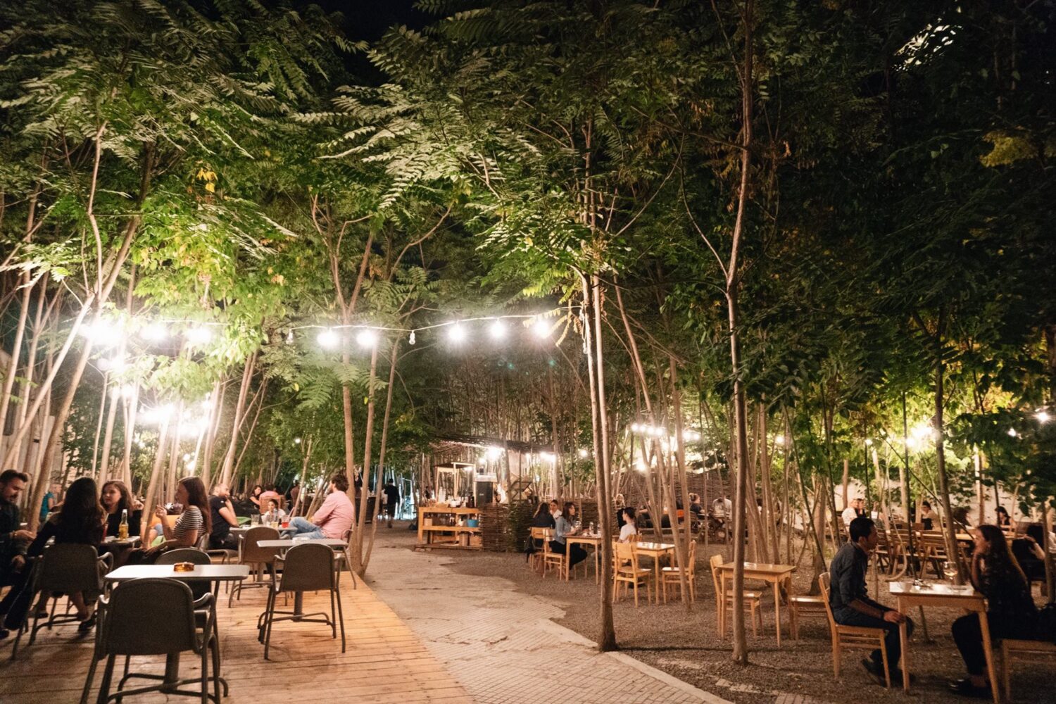terasa Lente Arcului din București, cu mesele pline, de o parte si alta a unei alei, cu ziduri portocalii luminate cu aplice si deasupra multa verdeata de la copaci