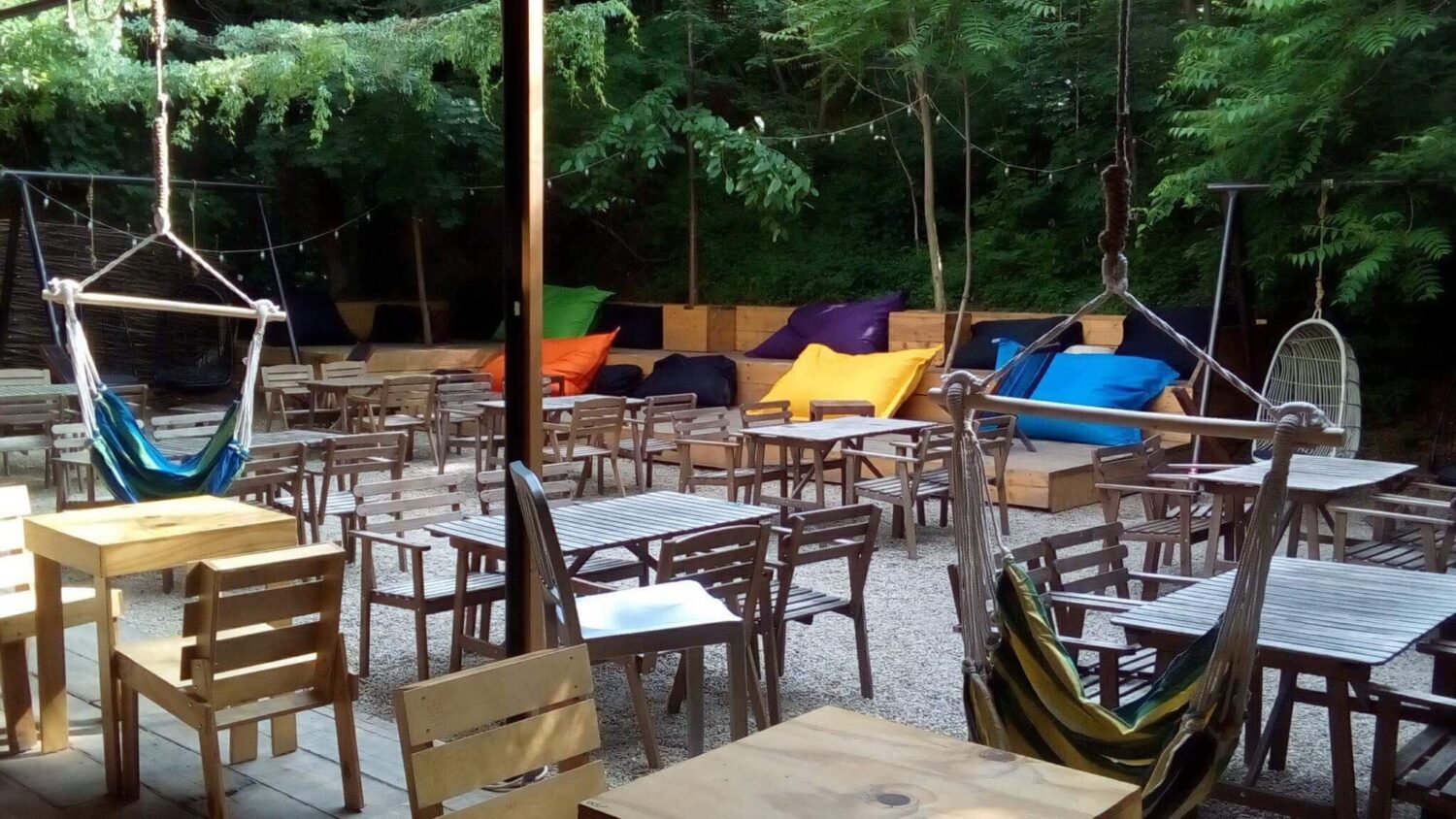 Terasa Infinitea din Cotroceni, cu mese mici si colorate si multa verdeata