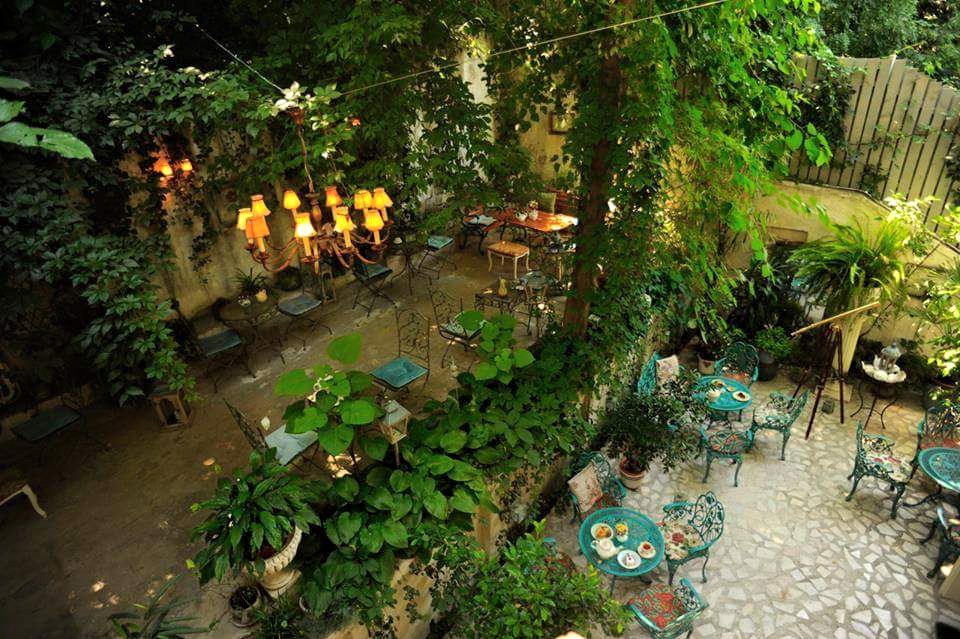 terasa colonial lounge, cu mese afara, si o alee pietonala in fata, fotografiata printre ramurile copacilor, una din cele mai verzi terase din București