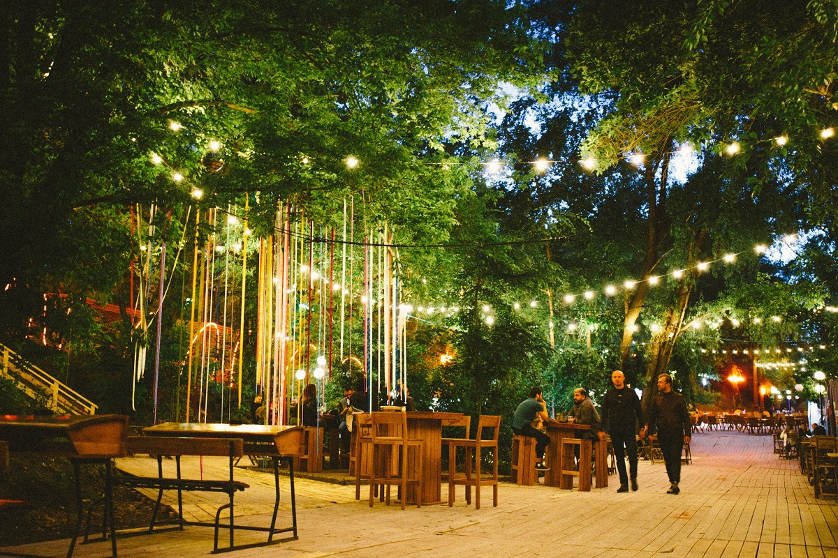 Gradina Eden (fosta Grădina Dorobanti) din Bucuresti, seara, cu mese printre copaci