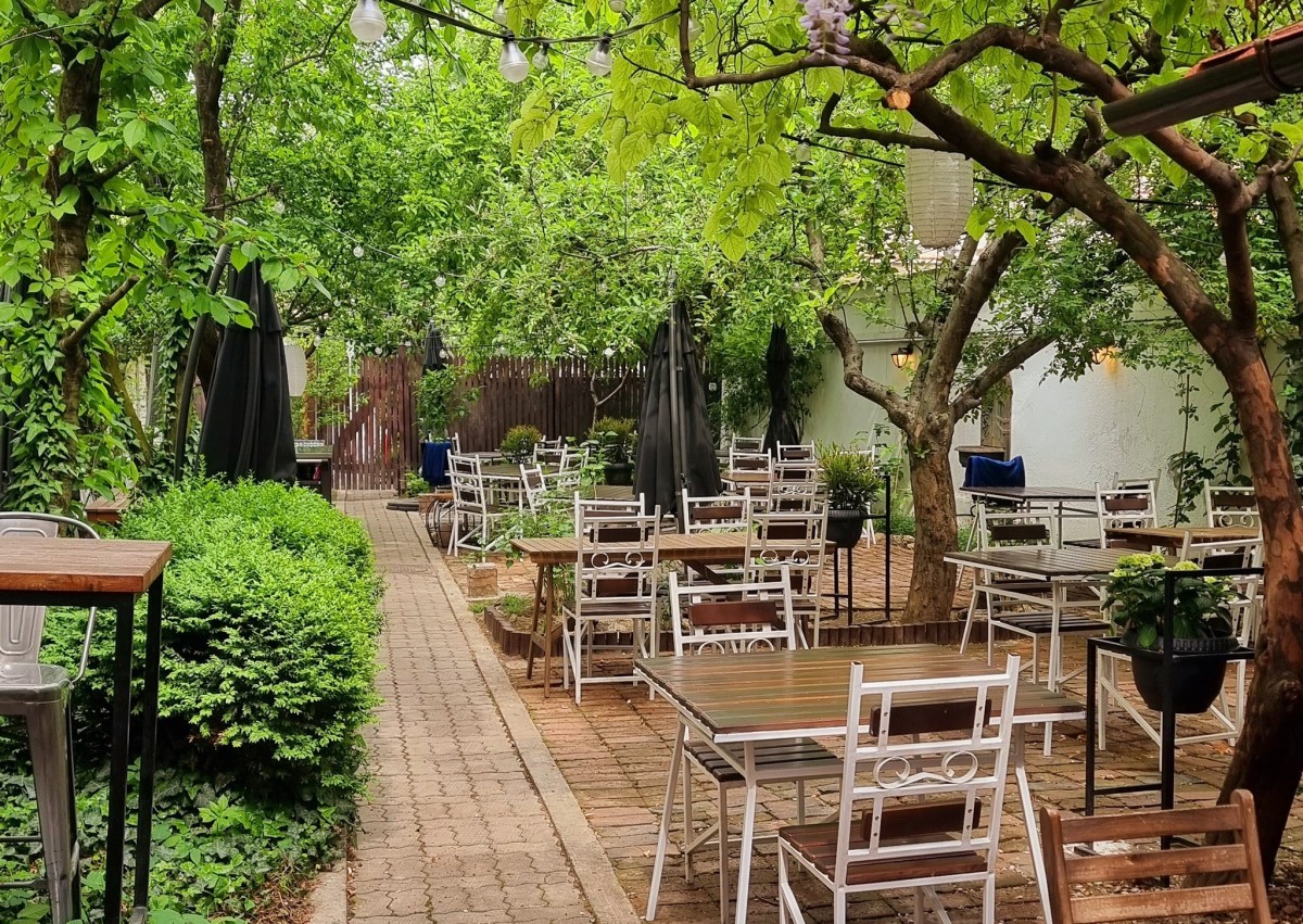 Terasa Suento din București, cu o alee pavata si mese asezate in gradina plina de copaci si plate de gradina