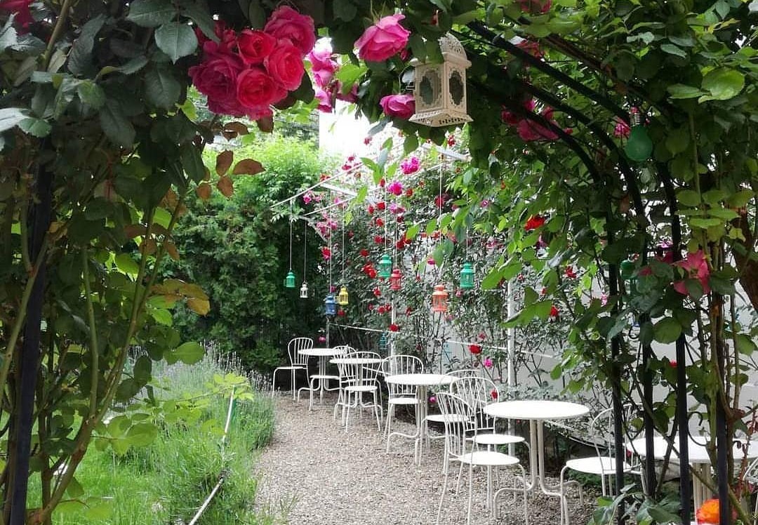 Terasa Greentea din București, fotografiata prin cadrul unei bolde de trandafiri, prin care se vad mesele albe, metalice, rotunde, curtea plina de iarba si zidurile acoperite de trandafiri