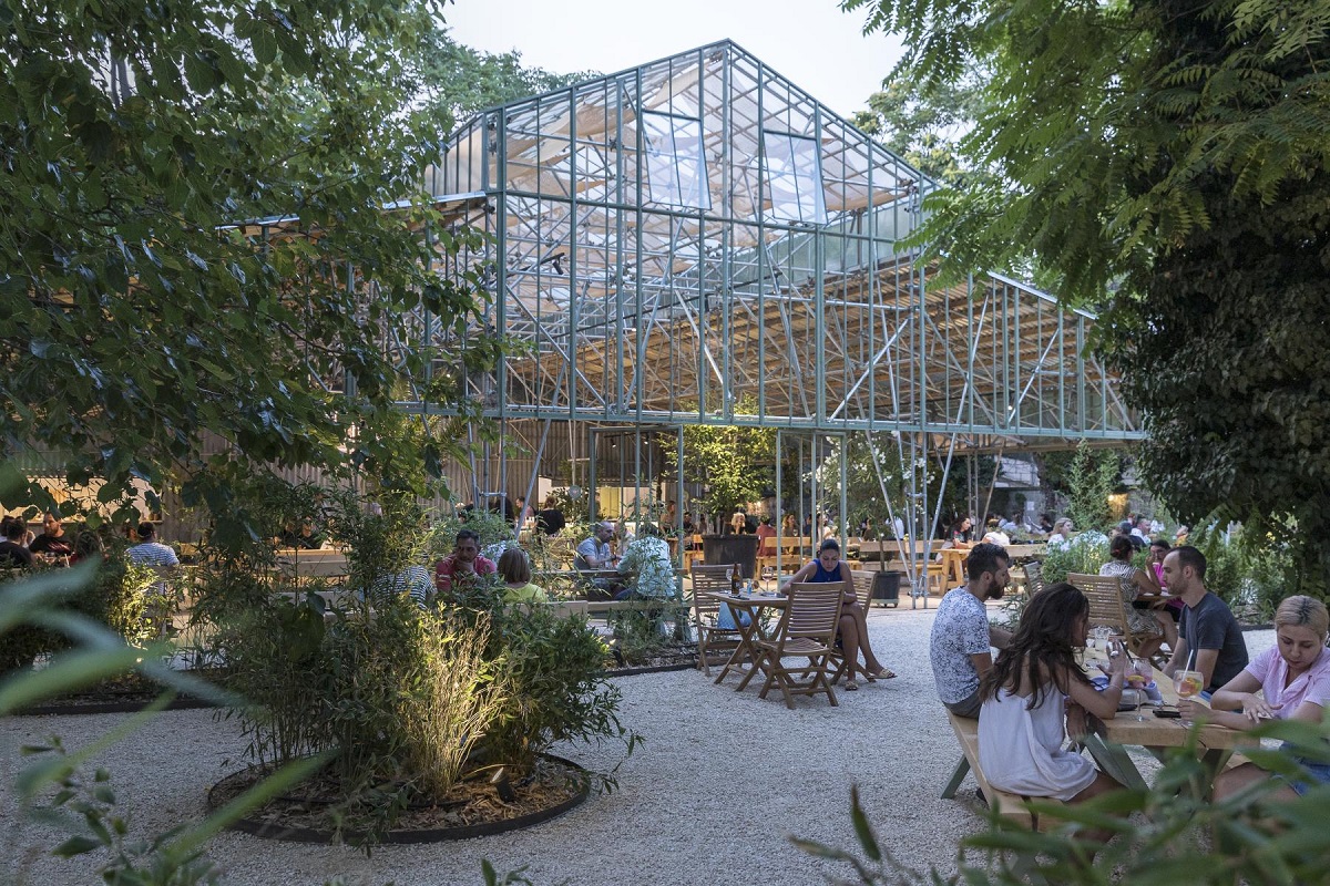 Sera Eden, pe structura metalica si geamuri mari, si curtea din jur, cu oameni la mese copaci si plante, una din cele mai verzi terase din București