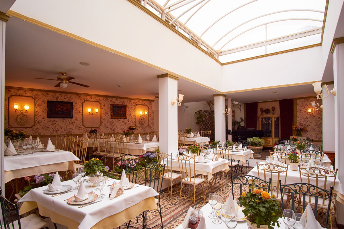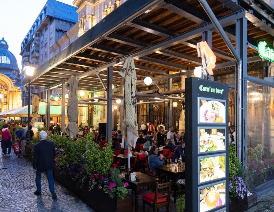 terasa de la Caru cu bere din Bucuresti, acoperita, cu oameni asezati la mese