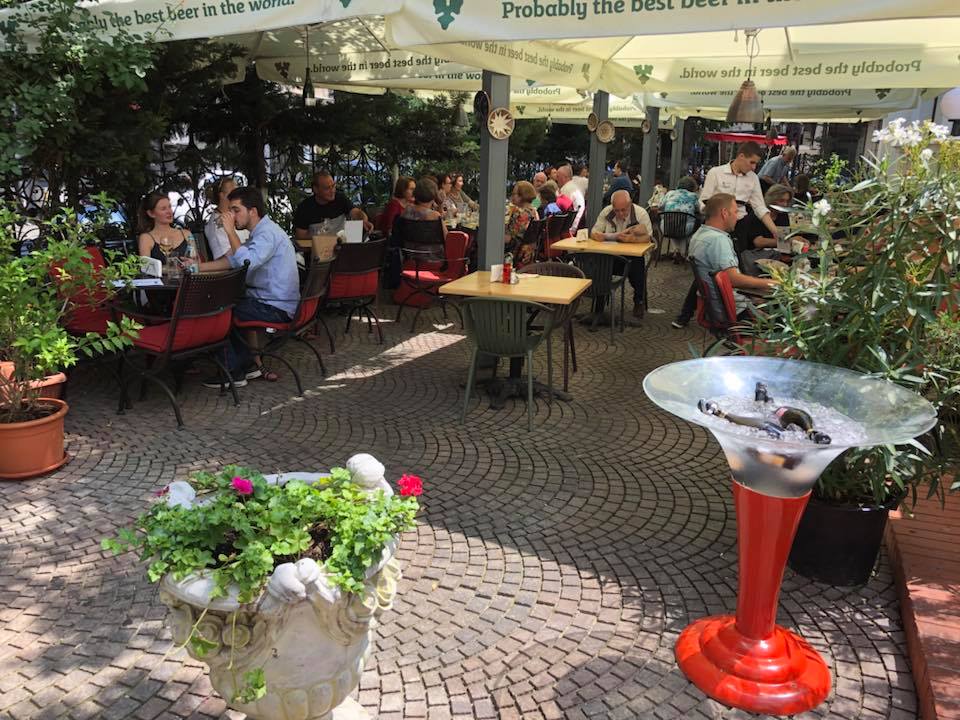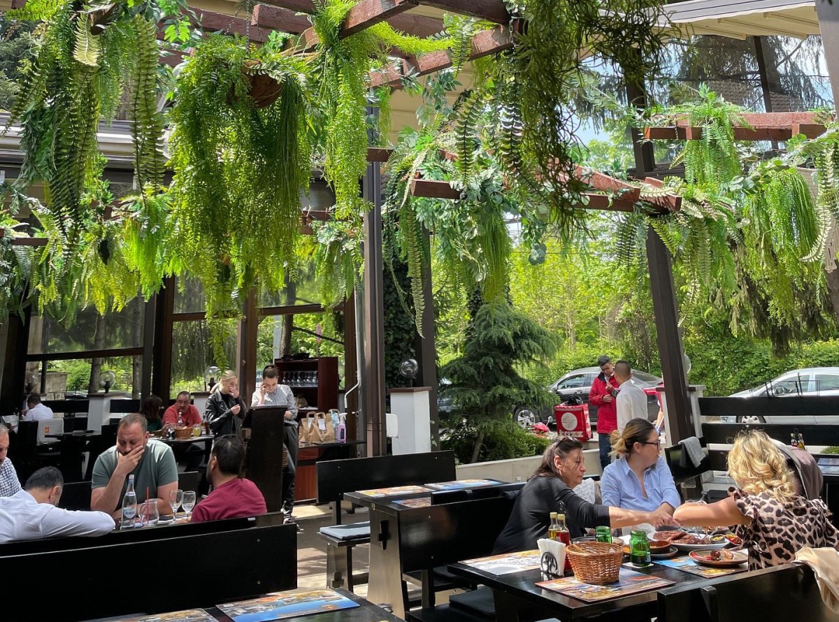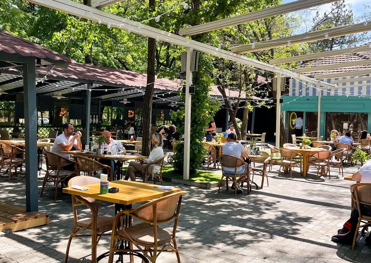 terasa de la restaurant La Mama, cu copertine si oameni asezati la mese