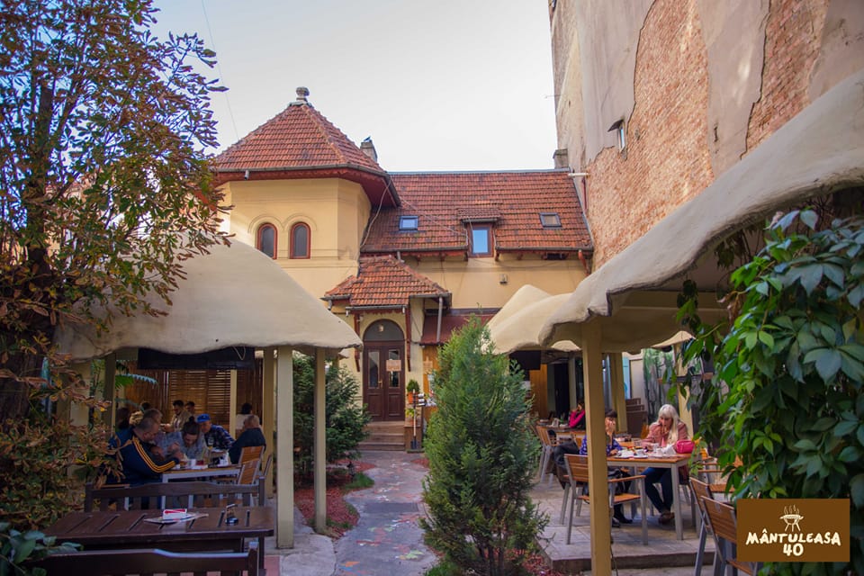 terasa de la mantuleasa 40, cu foisoare sub care se afla mese si in spate o casa cu etaj