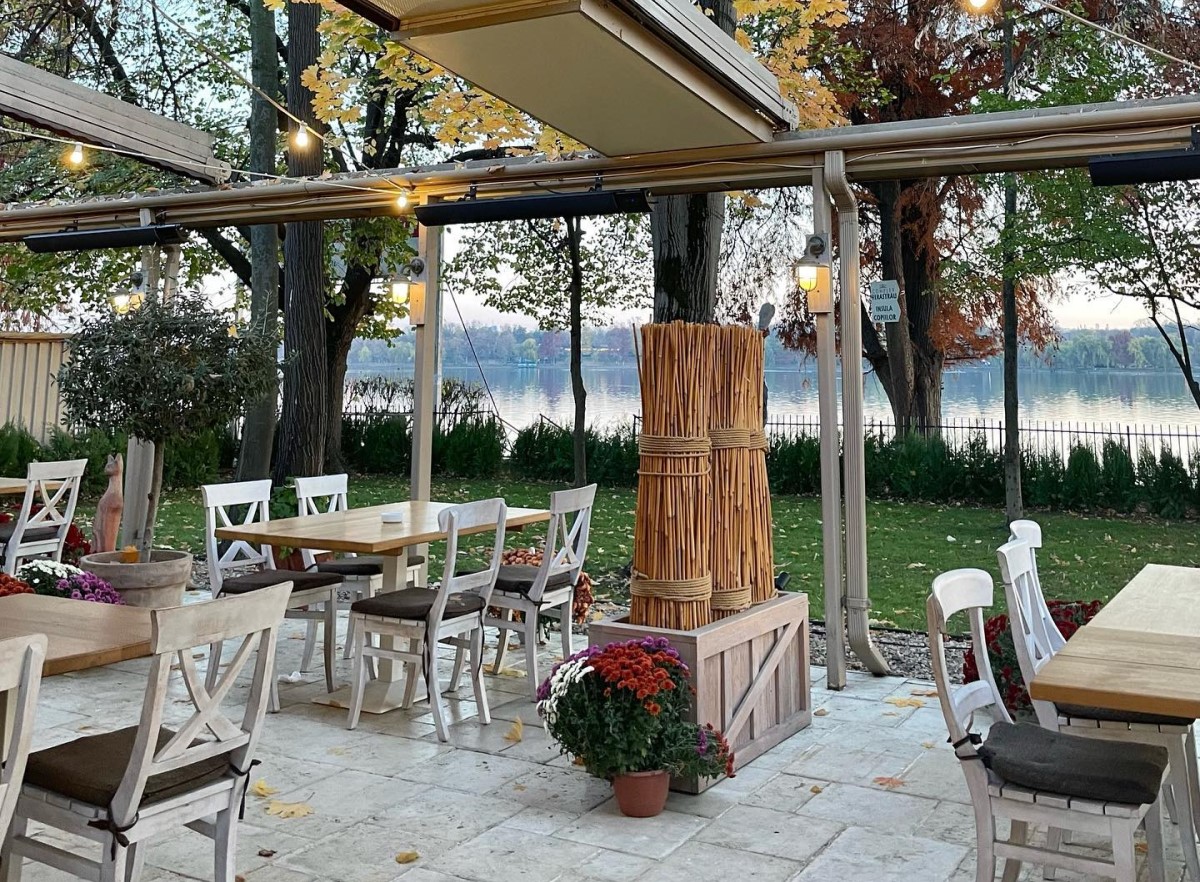 terasa de la restaurant Ancora din Bucuresti, cu mese din lemn si scaune albe, un manunchi de stuff ca decor, gazon si lacul Herastrau ce se vede in fundal