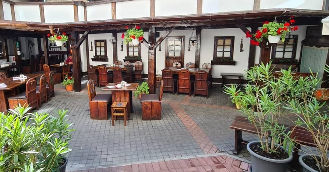 terasa de la Restaurant Vatra, amenajata rustic cu mobilier de lemn si muscate decorative