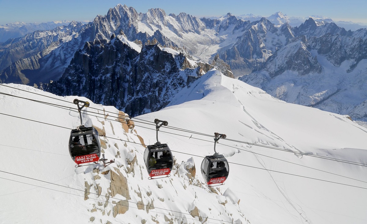 r telecabine care urca pe munte, iar sub ele muntele Mont Blac unde să mergi la schi în Franța