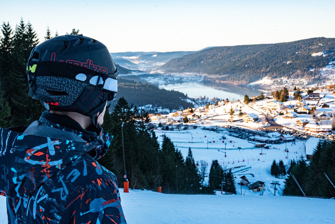 prim plan cu un barbat echipat la schi în Franța care priveste catre statiunea Gerardmer aflata in vale