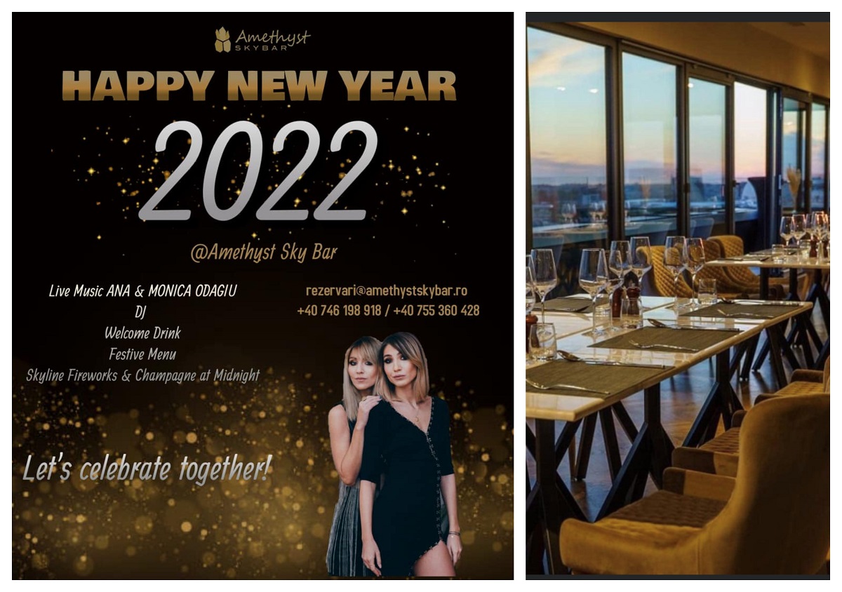 Amethyst Sky Bar este un loc sofisticat, perfect pentru a celebra Revelionul. Dacă vrei să experimentezi ceva cu totul diferit față de ce înseamnă o petrecere de Anul Nou într-un club, spre exemplu, poți să întâmpini 2022 într-un mare stil, la unul din cele mai faine restaurante de tip skyline din București.