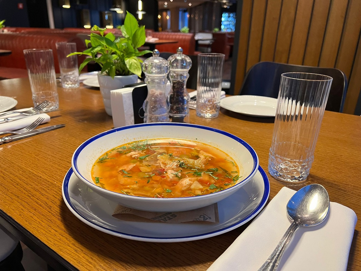 La White Horse Restaurant & Pub fac mâncare foarte bună mereu. Și de luni până vineri vin cu un meniu de prânz de nota 10! În fiecare zi au câte ceva nou, întotdeauna proaspăt. Tocmai de asta nu o să îți recomand o ciorbă anume – trebuie să urmărești meniul zilei. Dar, spre exemplu, la ei am mâncat de curând o ciorbă de curcan acrită cu zeamă de varză care a fost nemaipomenită! Am mai văzut în meniu și ciorbă de gâscă cu leuștean, ciorbă de rață, sau supă cremă de legume cu porumb ori supă cremă de roșii cu mozzarelline și busuioc.