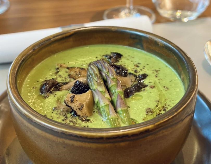 La ei găsești o supă cremă de sparanghel sen-za-ți-o-na-lă! Cu ciuperci Morel (zbârciogi, adică) și trufe negre. Ce să mai… la crème de la crème!